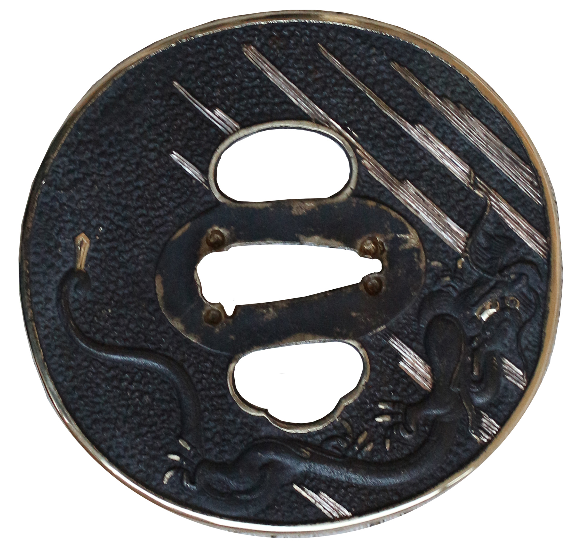 Оправа (拵え, коширае). Гарда (鍔, цуба) виконана у стилі татемару («кругла»), з отворами хіттсу-ана під ножик кодзука та шпильку когай, декорована фітоморфними мотивами з ділянками золочення. Тло розроблено у техніці нанако.