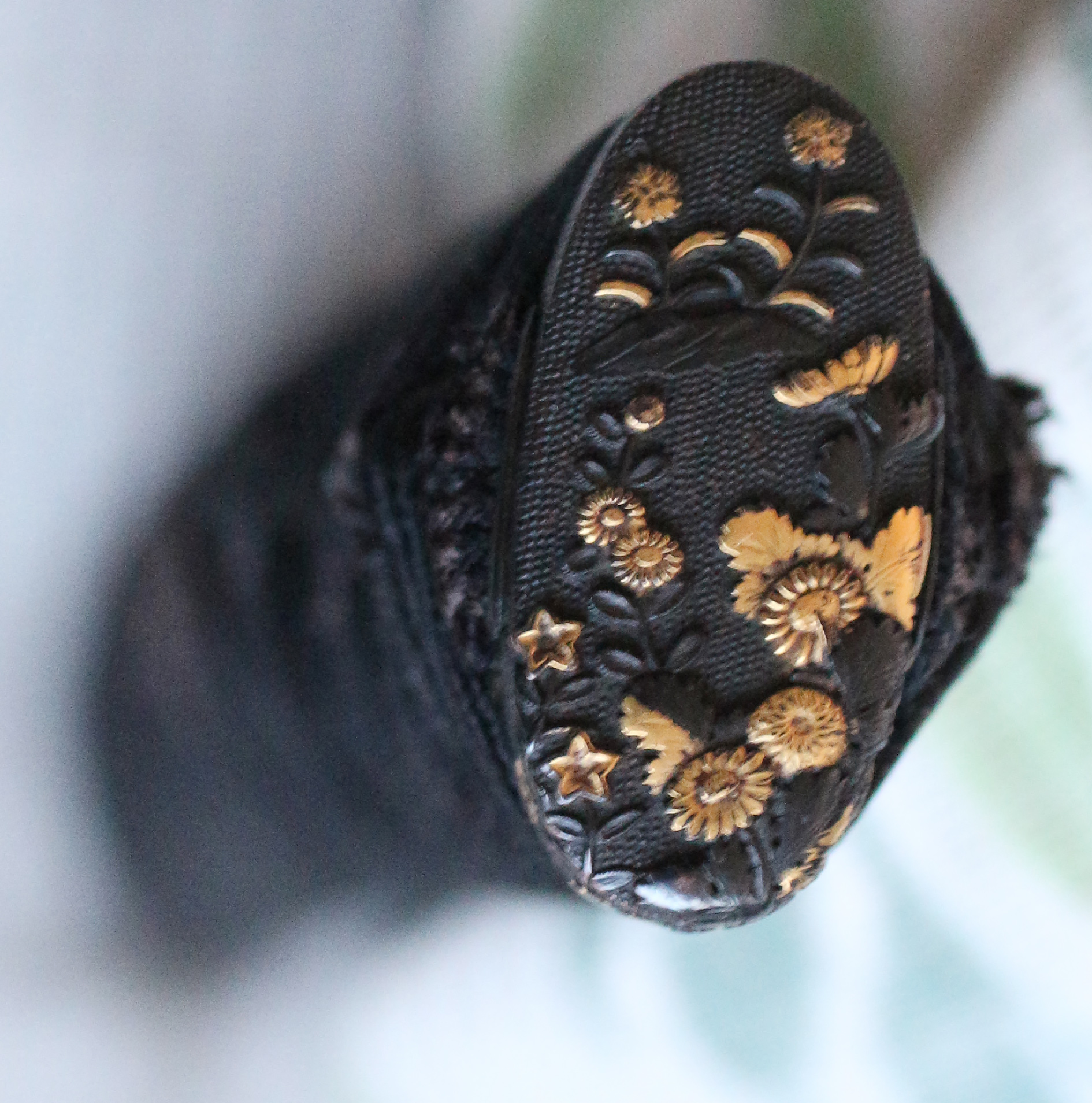 Оздоблення руків’я (менукі), виконані із сякудо у вигляді флористичної композиції, оздоблені ділянками золочення.