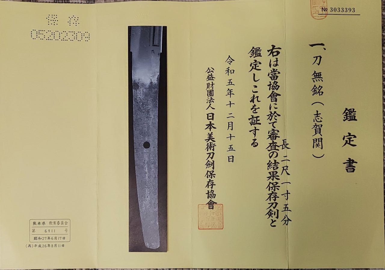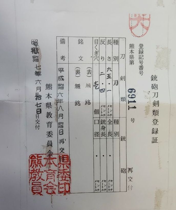 Реєстраційне свідоцтво на зброю 銃砲刀剣類登録証 [Jūhō tōken-rui tōroku-shō] департамента освіти префектури Кумамото 熊本県教育委員会 [Kumamotoken kyōiku iinkai] №6911, перша реєстрація 17.06.1952 р., повторна – від 11.08.2014 р. Зазначеним документом Агентство у справах культури Японії (Bunkacho) визнає меч витвором мистецтва.