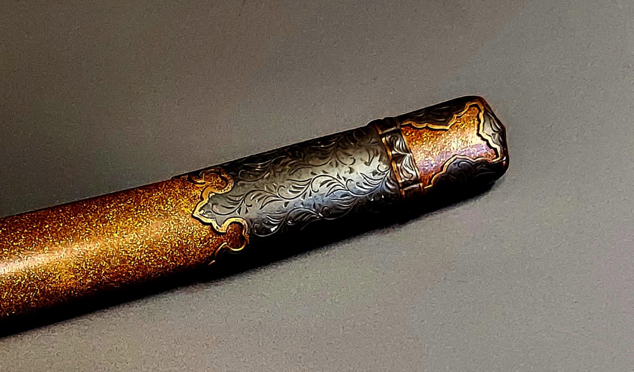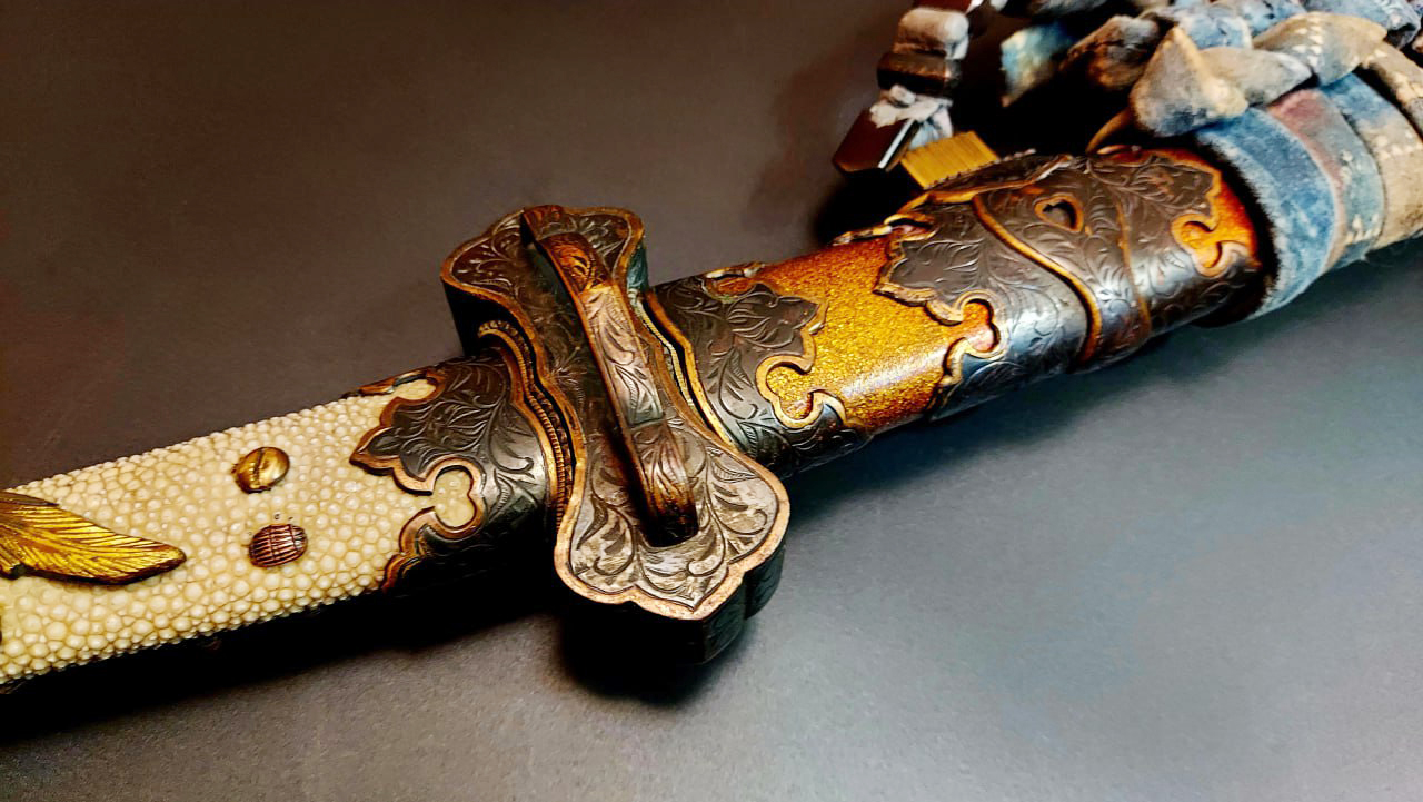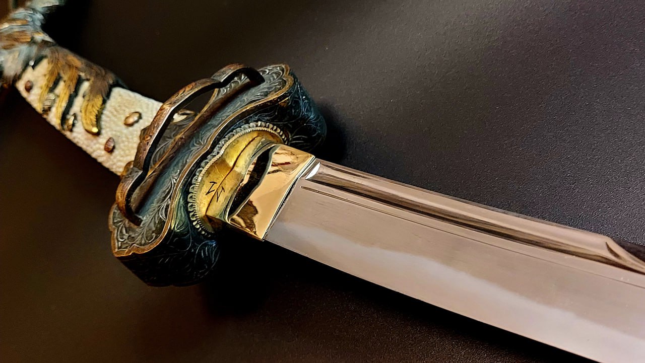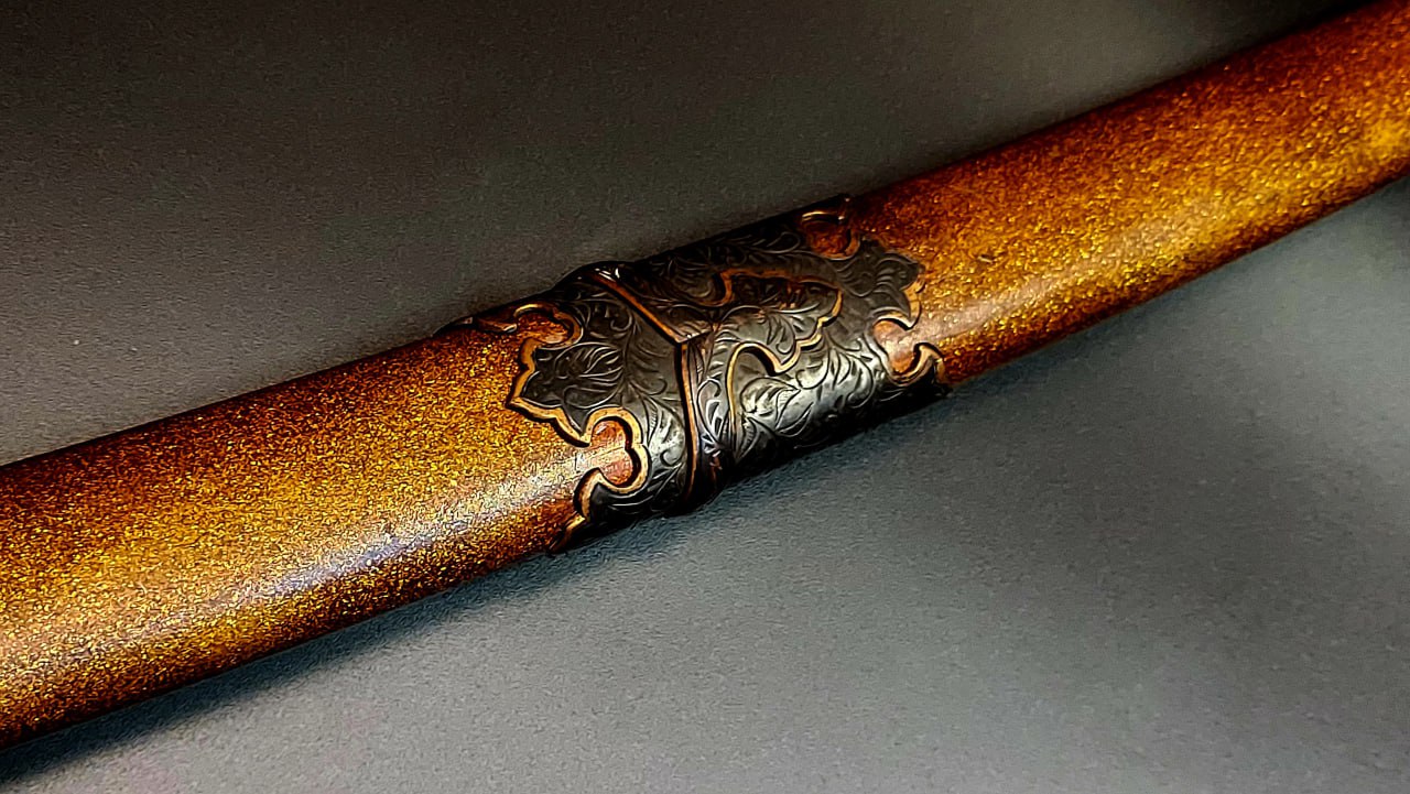 Гарда (鍔, цуба) латунна, плоска, у стилі кара-цуба («китайська гарда»), декорована флористичним орнаментом з ділянками золочення.