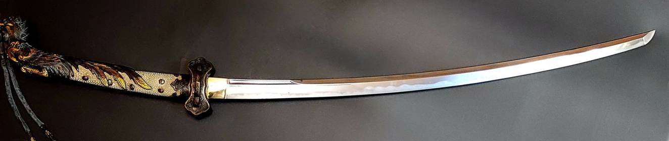 Виробнича школа. Клинок не має підпису, але особливості форми та загартування свідчать про його приналежність до ковальської школи Шига-секі (志賀関). Школа представляє відгалудження засадничого напряму ковальської традиції Міно-ден, яка від середини періоду Муроматі гуртувала ковалів навколо міста Секі провінції Міно. Поряд з продукцією ковалів Бідзен, клинки Міно випускались у великій кількості, що пов’язано зі значними потребами інтенсивних феодальних війн періоду Сенгоку («Періоду ворогуючих держав», 1392-1573 рр.). Відповідаючи на нові виклики, ковалі Секі розробили передові методи виробництва, які дозволили підвищити обсяги виготовлення зброї без втрати її якості. Чимало майстрів переїхало до сусідніх провінцій, які перебували під владою ворогуючих даймьо. Так провінцією Міно володів Акеші Мітсухіде, натомість Суруга правив Іеясу Токугава, а Оварі контролював Ода Нобунага. Саме географічне становище провінції Міно сприяло великій кількості замовлень мечів сусідніми даймьо у місцевих ковалів, чиї клинки славились своєю практичністю та чудовими характеристиками.