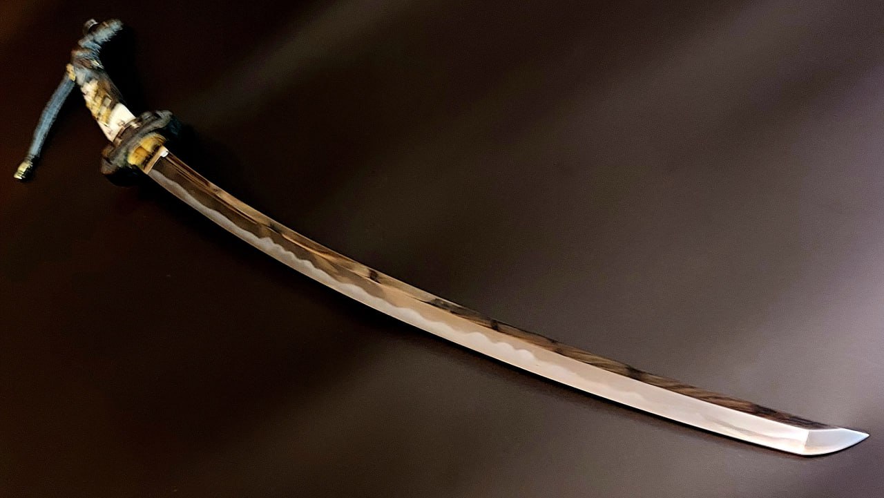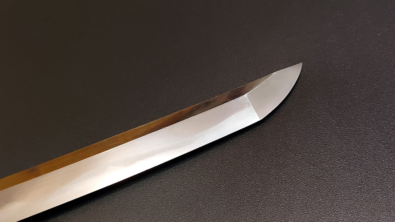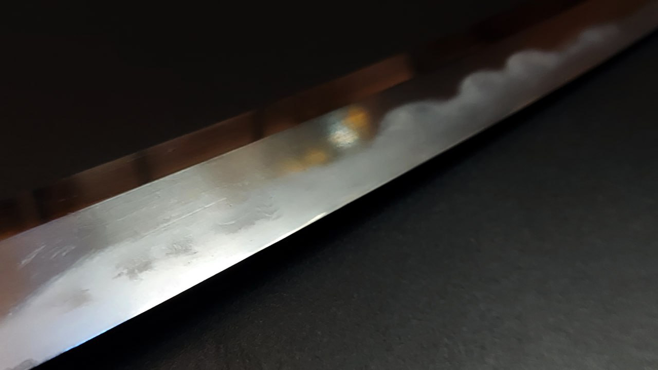 Загартування. Клинок має традиційне полірування. Хада (фактура сталі) має виразну змішану структуру у вигляді мокуме («кора дерева») та ітаме («сучкуватий зріз деревини»), зі вкрапленнями численних дзі-ніе – крупних кристалів мартенситу, розташованих у «м’якому» тілі клинка з нижчою твердістю. Простежується уцурі («віддзеркалення») – світлими полосками перлиту.