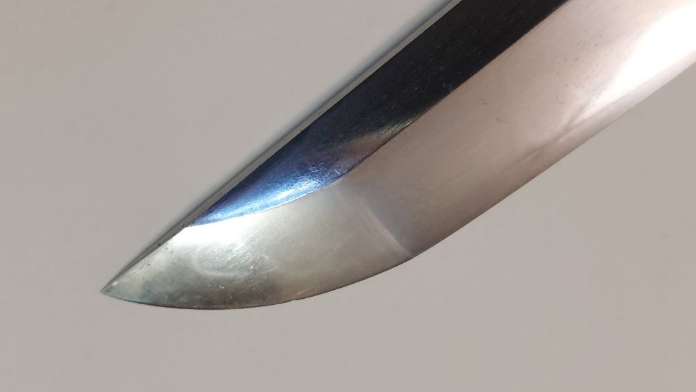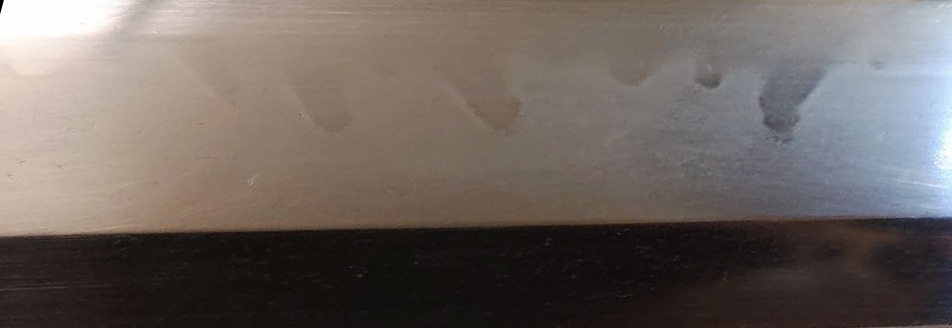 Загартування. Клинок має традиційне полірування, маркування у 6 ліній свідчить про роботу полірувальників школи Фуджиширо.