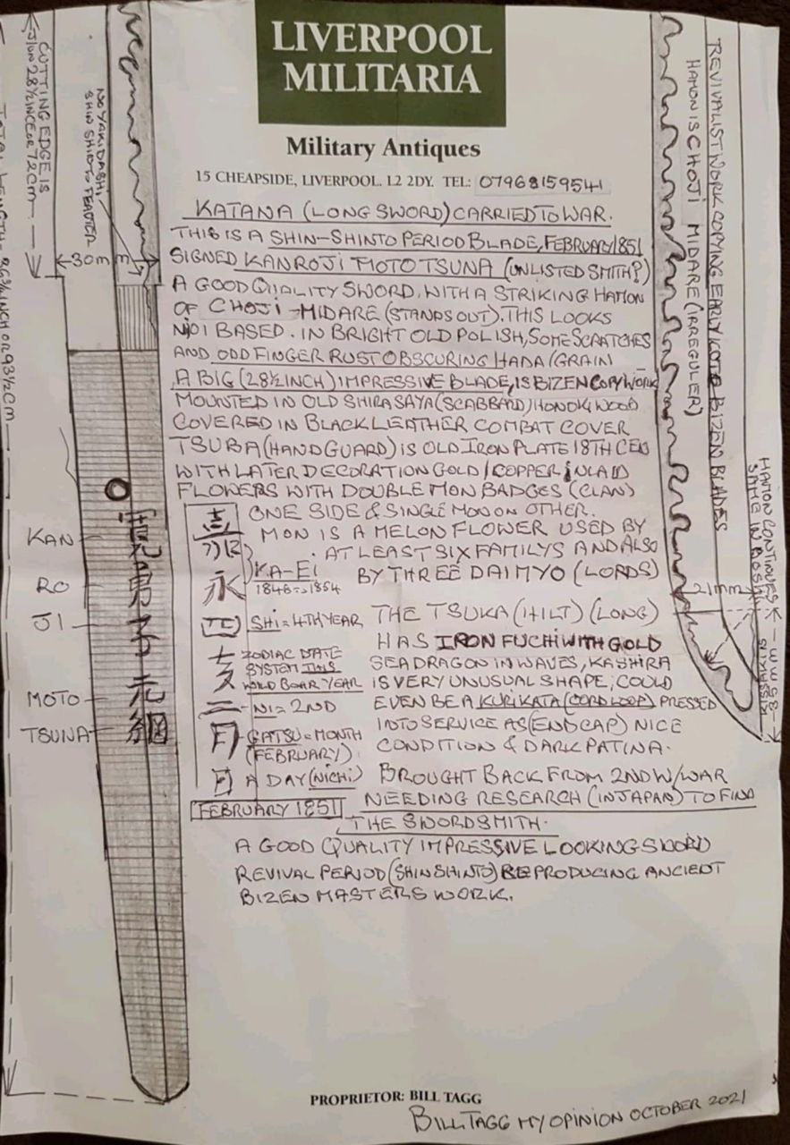 Документи: експертний висновок на бланку антикварного магазину Liverpool Militaria (Ліверпуль, Велика Британія), за підписом Білл Тег (Bill Tagg), жовтень, 2021 р.