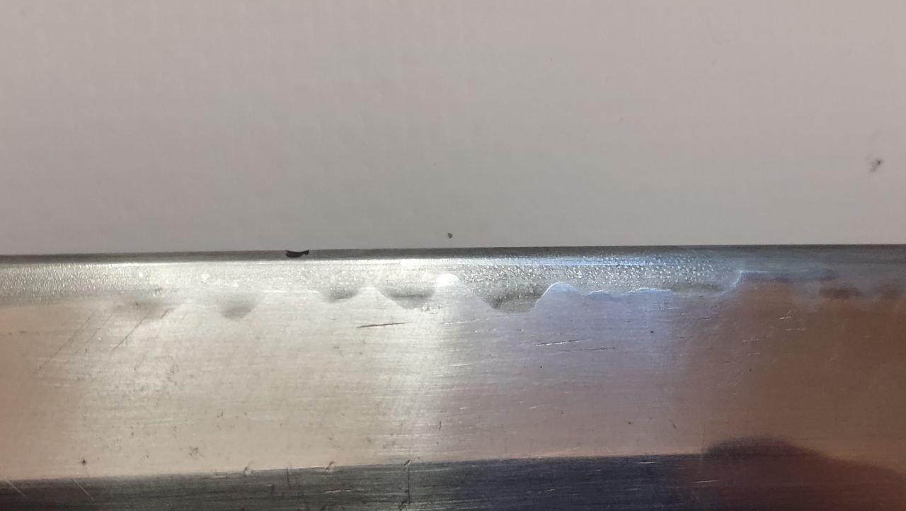 Загартування. Клинок виготовлено у нетрадиційний спосіб, – на ньому не простежується хада (фактура сталі), хатаракі (елементи загартування), також відсутнє традиційне для клинка ручної роботи полірування. Натомість нанесено штучний хамон (лінію загартування).
