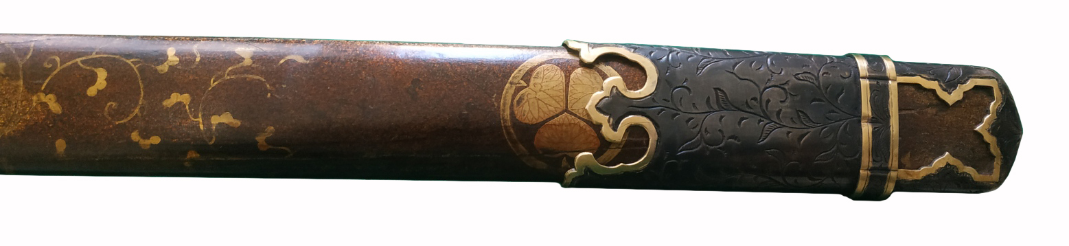 Піхви (鞘, сая) складаються з двох склеєних між собою дерев’яних половинок, виготовлених з японської магнолії (хоно-кі), мають овальну форму у перетині. Поверхня вкрита коричневим лаком та розписана золотою фарбою із зображеннями золотих листочків та мон аой (мальва). Устя (коі-гуті) обкладене широкою латунною фігурною окантовкою кутігане. Нижче розташовані три скріплюючі обручі. На двох із них, що знаходяться ближче до устя, закріплені обоймиці (асі) з петлями для шовкового шнура. На нижньому обручі, що знаходиться ближче до кінця піхов, закріплене фігурне скріплююче кільце (сібабікі), що зазвичай є самостійною деталлю у конструкції таті. Подовжений наконечник-колодка (ісідзуке), утворений з двох окремих деталей, скріплених прихованою пайкою. Металева фурнітура декорована флористичним орнаментом.