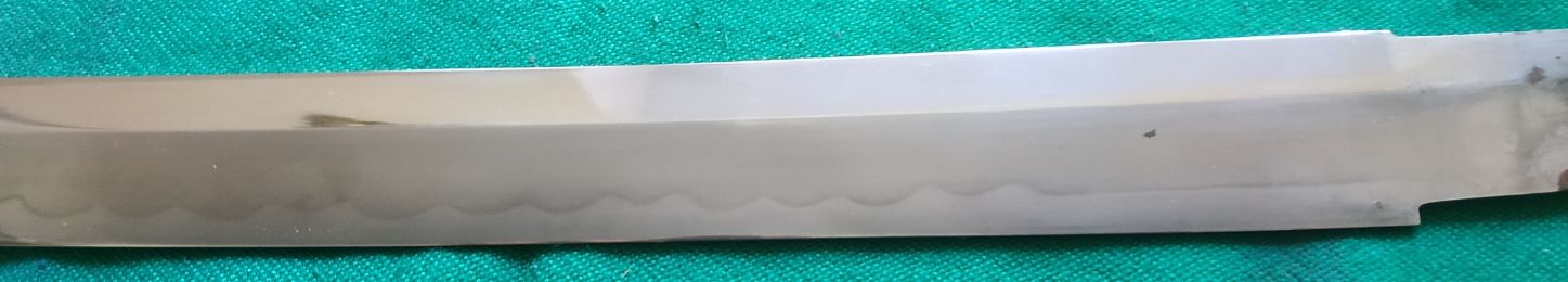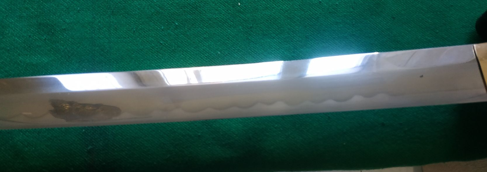 Загартування. Клинок має традиційне полірування. Хада (фактура сталі) не простежується (мудзі) через дзеркальне полірування.