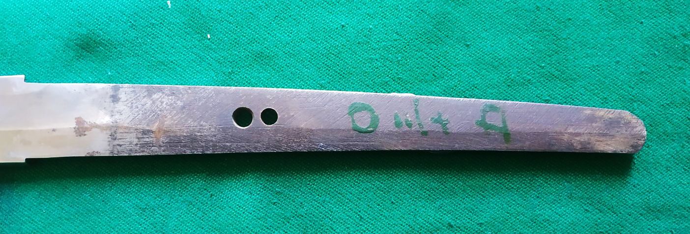 Підписи на клинку: ура-мей (підпис на внутрішній частині хвостовика): 濃州関住服部正広作 [Noshu Seki ju Hattori Masahiro saku] (Зробив Хатторі Масахіро, мешканець Секі).