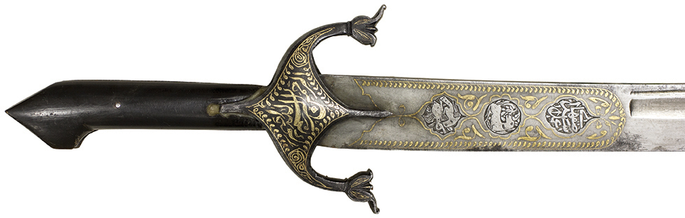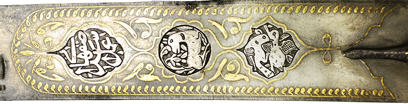 У медальйонах на клинку у техніці оброну виконані зображення тварин. Хоча подібні медальйони відомі на арабській і кавказькій зброї, сам спосіб виконання зображень – типово іранський.